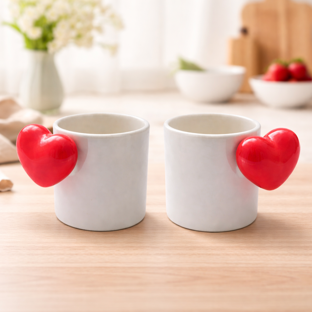 A charming set of 2 handcrafted ceramic cups featuring a minimalist white finish with bold red heart-shaped handles. Designed to add warmth and character to everyday coffee and tea moments, these cups are made from high-temperature fired stoneware for durability and heat retention. Microwave & dishwasher safe, perfect for couples, gifting, and cozy home use.