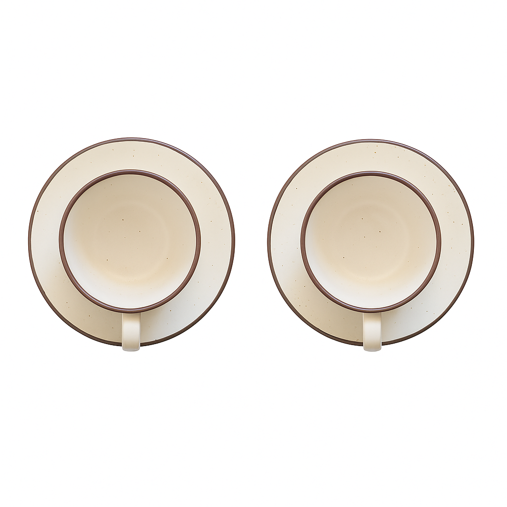 Premium Ceramic Cup & Saucer Set | Set of 2| Speckled Beige with Brown Rim | Handmade Stoneware Tea & Coffee Cup